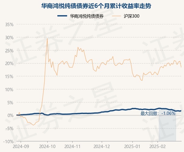 证券之星消息,2月28日,华商鸿悦纯债债券最新单位净值为1.0275元,累计净值为1.0637元,较前一交易日上涨0.14%。历史数据显示该基金近1个月下跌0.63%,近3个月上涨0.78%,近6个月上涨1.69%,近1年上涨3.34%。该基金近6个月的累计收益率走势如下图: