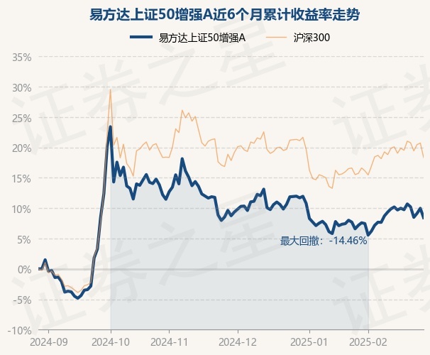 证券之星消息,2月28日,易方达上证50增强A最新单位净值为1.812元,累计净值为3.802元,较前一交易日下跌1.4%。历史数据显示该基金近1个月上涨0.91%,近3个月下跌0.28%,近6个月上涨8.44%,近1年上涨4.51%。该基金近6个月的累计收益率走势如下图: