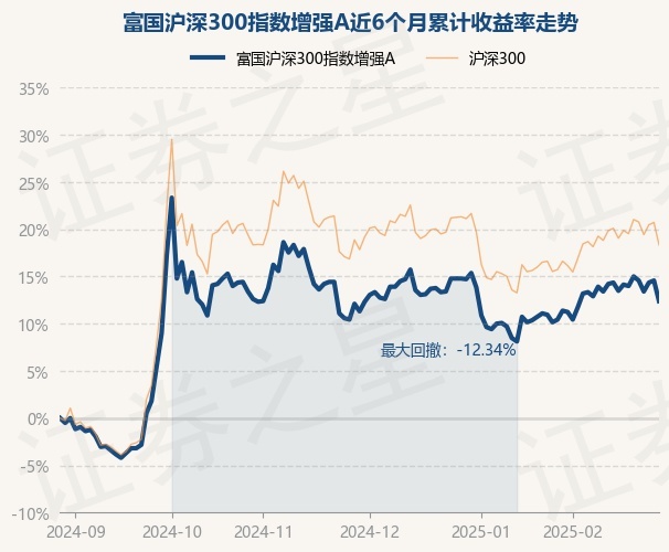 证券之星消息,2月28日,富国沪深300指数增强A最新单位净值为1.551元,累计净值为2.137元,较前一交易日下跌1.9%。历史数据显示该基金近1个月上涨1.04%,近3个月上涨0.98%,近6个月上涨12.39%,近1年上涨11.34%。该基金近6个月的累计收益率走势如下图: