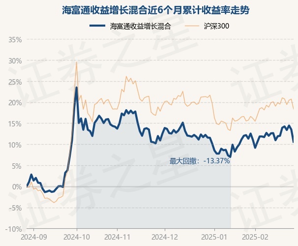 证券之星消息,2月28日,海富通收益增长混合最新单位净值为2.09元,累计净值为3.75元,较前一交易日下跌2.56%。历史数据显示该基金近1个月下跌0.43%,近3个月下跌0.29%,近6个月上涨10.58%,近1年上涨7.68%。该基金近6个月的累计收益率走势如下图: