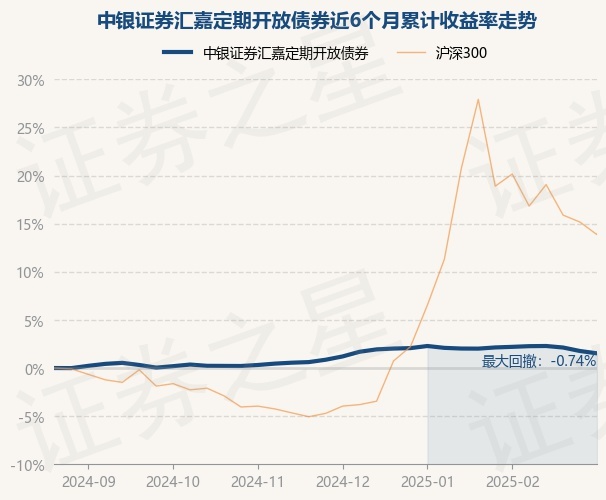 证券之星消息,2月28日,中银证券汇嘉定期开放债券最新单位净值为1.1468元,累计净值为1.3052元,较前一交易日下跌0.23%。历史数据显示该基金近1个月下跌0.6%,近3个月上涨0.9%,近6个月上涨1.52%,近1年上涨3.8%。该基金近6个月的累计收益率走势如下图: