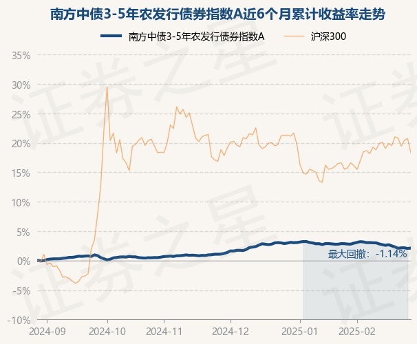 证券之星消息,2月28日,南方中债3-5年农发行债券指数A最新单位净值为1.1024元,累计净值为1.2554元,较前一交易日上涨0.06%。历史数据显示该基金近1个月下跌0.81%,近3个月上涨0.9%,近6个月上涨2.12%,近1年上涨4.69%。该基金近6个月的累计收益率走势如下图: