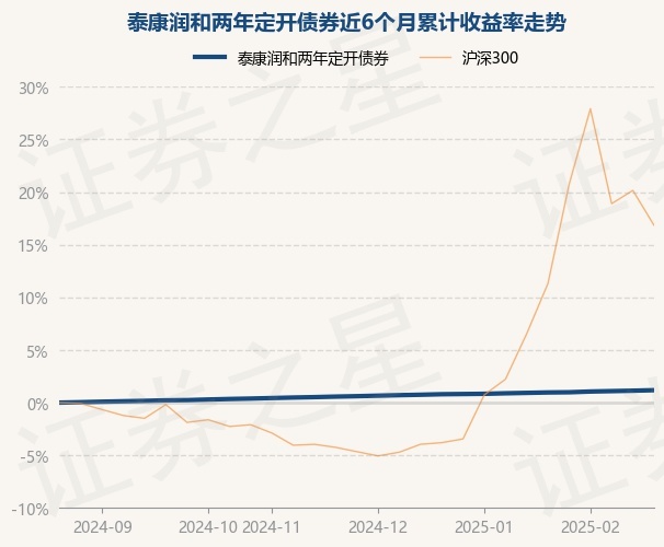 证券之星消息,2月28日,泰康润和两年定开债券最新单位净值为1.0273元,累计净值为1.1387元,较前一交易日上涨0.05%。历史数据显示该基金近1个月上涨0.2%,近3个月上涨0.61%,近6个月上涨1.18%,近1年上涨2.34%。该基金近6个月的累计收益率走势如下图: