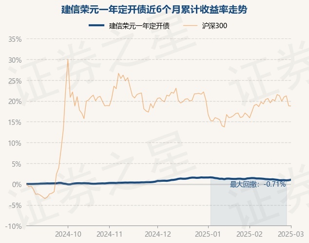 证券之星消息,3月3日,建信荣元一年定开债最新单位净值为1.0904元,累计净值为1.1354元,较前一交易日上涨0.11%。历史数据显示该基金近1个月下跌0.31%,近3个月上涨0.29%,近6个月上涨1.04%,近1年上涨2.94%。该基金近6个月的累计收益率走势如下图: