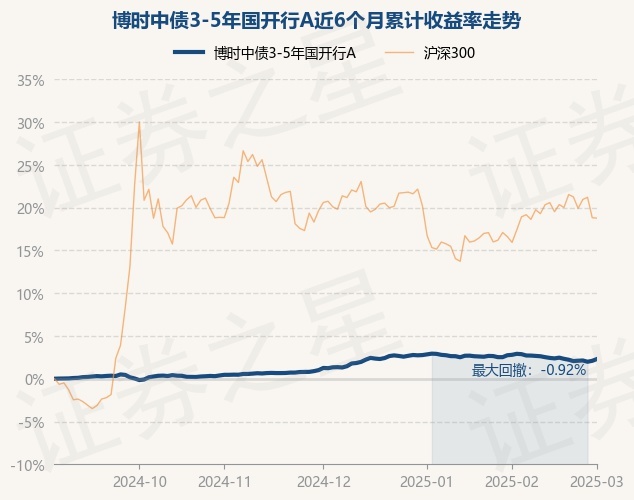 证券之星消息,3月3日,博时中债3-5年国开行A最新单位净值为1.0497元,累计净值为1.2213元,较前一交易日上涨0.21%。历史数据显示该基金近1个月下跌0.43%,近3个月上涨1.05%,近6个月上涨2.3%,近1年上涨5.12%。该基金近6个月的累计收益率走势如下图: