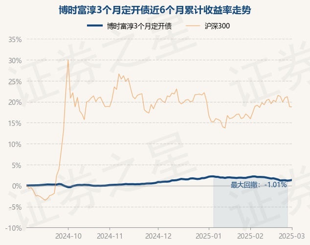 证券之星消息,3月3日,博时富淳3个月定开债最新单位净值为1.0132元,累计净值为1.2078元,较前一交易日上涨0.12%。历史数据显示该基金近1个月下跌0.63%,近3个月上涨0.51%,近6个月上涨1.33%,近1年上涨3.33%。该基金近6个月的累计收益率走势如下图: