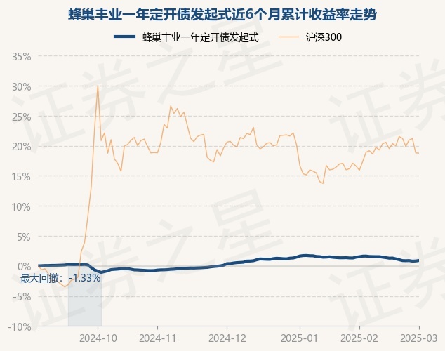 证券之星消息,3月3日,蜂巢丰业一年定开债发起式最新单位净值为1.0772元,累计净值为1.2113元,较前一交易日上涨0.08%。历史数据显示该基金近1个月下跌0.54%,近3个月上涨0.51%,近6个月上涨0.9%,近1年上涨2.73%。该基金近6个月的累计收益率走势如下图: