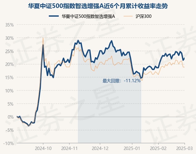 证券之星消息,3月3日,华夏中证500指数智选增强A最新单位净值为1.0253元,累计净值为1.0253元,较前一交易日上涨0.63%。历史数据显示该基金近1个月上涨3.07%,近3个月下跌2.24%,近6个月上涨22.19%,近1年上涨9.28%。该基金近6个月的累计收益率走势如下图: