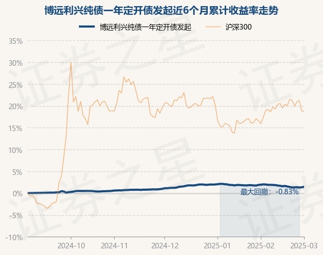 证券之星消息,3月3日,博远利兴纯债一年定开债发起最新单位净值为1.0347元,累计净值为1.0818元,较前一交易日上涨0.11%。历史数据显示该基金近1个月下跌0.43%,近3个月上涨0.32%,近6个月上涨1.45%,近1年上涨3.44%。该基金近6个月的累计收益率走势如下图: