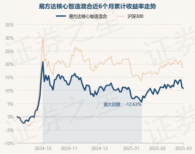 证券之星消息,3月3日,易方达核心智造混合最新单位净值为0.8692元,累计净值为0.8692元,较前一交易日下跌0.2%。历史数据显示该基金近1个月上涨0.99%,近3个月下跌0.61%,近6个月上涨10.74%,近1年上涨12.42%。该基金近6个月的累计收益率走势如下图: