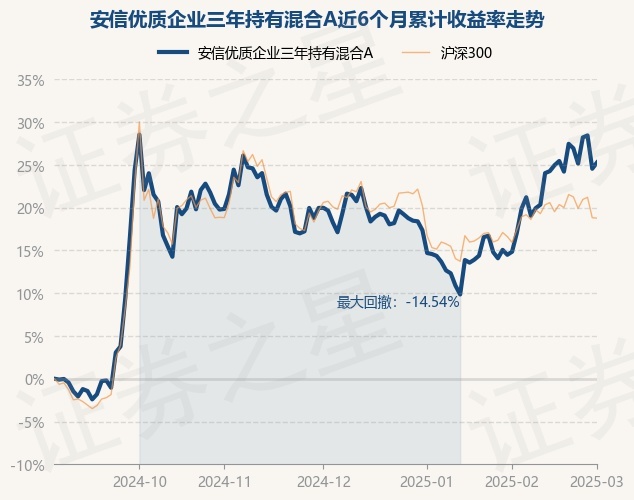 证券之星消息,3月3日,安信优质企业三年持有混合A最新单位净值为0.856元,累计净值为0.856元,较前一交易日上涨0.59%。历史数据显示该基金近1个月上涨9.42%,近3个月上涨4.7%,近6个月上涨25.27%,近1年上涨20.85%。该基金近6个月的累计收益率走势如下图: