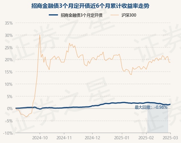 证券之星消息,3月3日,招商金融债3个月定开债最新单位净值为1.0488元,累计净值为1.1451元,较前一交易日上涨0.15%。历史数据显示该基金近1个月下跌0.56%,近3个月上涨0.65%,近6个月上涨1.67%,近1年上涨4.0%。该基金近6个月的累计收益率走势如下图: