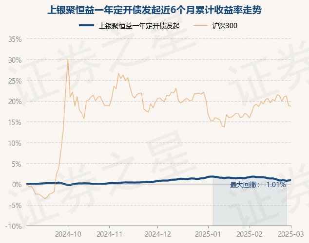 证券之星消息,3月3日,上银聚恒益一年定开债发起最新单位净值为1.0029元,累计净值为1.0723元,较前一交易日上涨0.11%。历史数据显示该基金近1个月下跌0.6%,近3个月上涨0.2%,近6个月上涨0.97%,近1年上涨2.62%。该基金近6个月的累计收益率走势如下图: