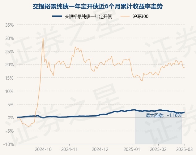 证券之星消息,3月3日,交银裕景纯债一年定开债最新单位净值为1.0447元,累计净值为1.1167元,较前一交易日上涨0.18%。历史数据显示该基金近1个月下跌0.64%,近3个月上涨0.9%,近6个月上涨1.95%,近1年上涨3.81%。该基金近6个月的累计收益率走势如下图: