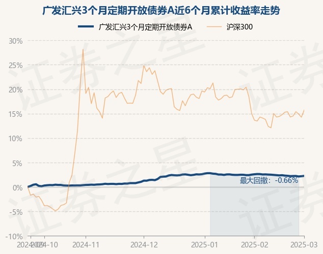 证券之星消息,3月3日,广发汇兴3个月定期开放债券A最新单位净值为1.0276元,累计净值为1.2296元,较前一交易日上涨0.07%。历史数据显示该基金近1个月下跌0.25%,近3个月上涨0.97%,近6个月上涨2.26%,近1年上涨4.67%。该基金近6个月的累计收益率走势如下图: