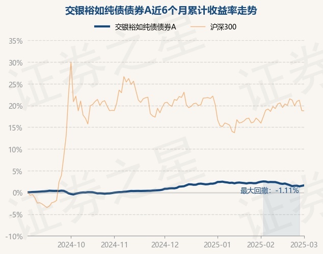 证券之星消息,3月3日,交银裕如纯债债券A最新单位净值为1.0759元,累计净值为1.2499元,较前一交易日上涨0.12%。历史数据显示该基金近1个月下跌0.67%,近3个月上涨0.78%,近6个月上涨1.63%,近1年上涨3.72%。该基金近6个月的累计收益率走势如下图: