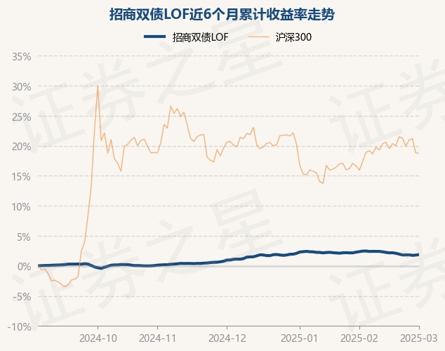 证券之星消息,3月3日,招商双债LOF最新单位净值为1.5945元,累计净值为1.7335元,较前一交易日上涨0.08%。历史数据显示该基金近1个月下跌0.4%,近3个月上涨0.89%,近6个月上涨1.87%,近1年上涨3.73%。该基金近6个月的累计收益率走势如下图: