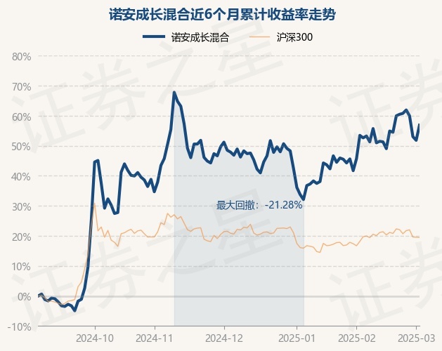 证券之星消息,3月4日,诺安成长混合最新单位净值为1.52元,累计净值为1.965元,较前一交易日上涨3.33%。历史数据显示该基金近1个月上涨10.71%,近3个月上涨6.07%,近6个月上涨56.86%,近1年上涨31.37%。该基金近6个月的累计收益率走势如下图:
