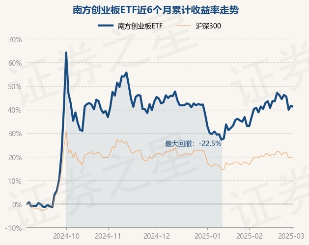 证券之星消息,3月4日,南方创业板ETF最新单位净值为2.3891元,累计净值为1.174元,较前一交易日下跌0.29%。历史数据显示该基金近1个月上涨6.1%,近3个月下跌1.0%,近6个月上涨41.2%,近1年上涨21.0%。该基金近6个月的累计收益率走势如下图:
