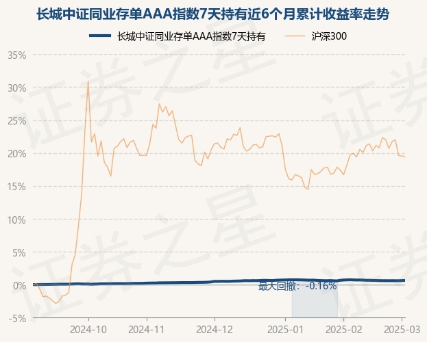 证券之星消息,3月4日,长城中证同业存单AAA指数7天持有最新单位净值为1.0463元,累计净值为1.0463元,较前一交易日上涨0.02%。历史数据显示该基金近1个月下跌0.02%,近3个月上涨0.13%,近6个月上涨0.64%,近1年上涨1.61%。该基金近6个月的累计收益率走势如下图: