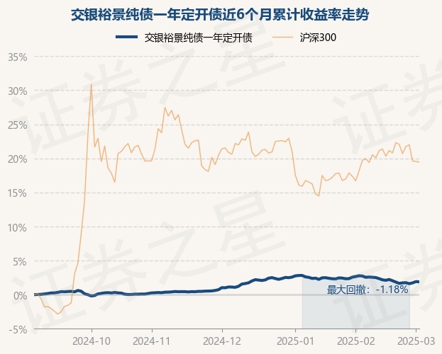 证券之星消息,3月4日,交银裕景纯债一年定开债最新单位净值为1.0444元,累计净值为1.1164元,较前一交易日下跌0.03%。历史数据显示该基金近1个月下跌0.67%,近3个月上涨0.75%,近6个月上涨1.88%,近1年上涨3.68%。该基金近6个月的累计收益率走势如下图: