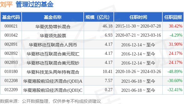 刘平女士:金融学硕士。2007年2月加入华夏基金管理有限公司,曾任行业研究员、投资经理、机构投资部总监、华夏优势增长混合型证券投资基金基金经理(2015年11月30日至2020年7月28日期间)等,现任股票投资部总监,华夏移动互联灵活配置混合型证券投资基金(QDII)基金经理(2016年12月14日起任职)、华夏领先股票型证券投资基金基金经理(2020年7月21日起任职)。2020年10月26日至2024年3月26日担任华夏科技龙头两年定期开放混合型证券投资基金基金经理。