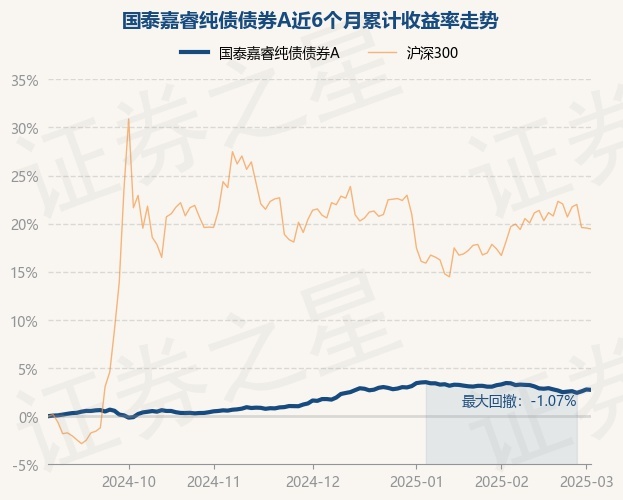 证券之星消息,3月4日,国泰嘉睿纯债债券A最新单位净值为1.0558元,累计净值为1.2631元,较前一交易日下跌0.04%。历史数据显示该基金近1个月下跌0.47%,近3个月上涨0.94%,近6个月上涨2.73%,近1年上涨6.59%。该基金近6个月的累计收益率走势如下图: