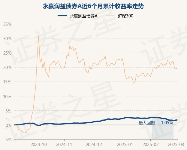 证券之星消息,3月4日,永赢润益债券A最新单位净值为1.1231元,累计净值为1.2551元,较前一交易日上涨0.0%。历史数据显示该基金近1个月下跌0.74%,近3个月上涨0.43%,近6个月上涨1.66%,近1年上涨4.42%。该基金近6个月的累计收益率走势如下图: