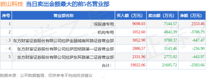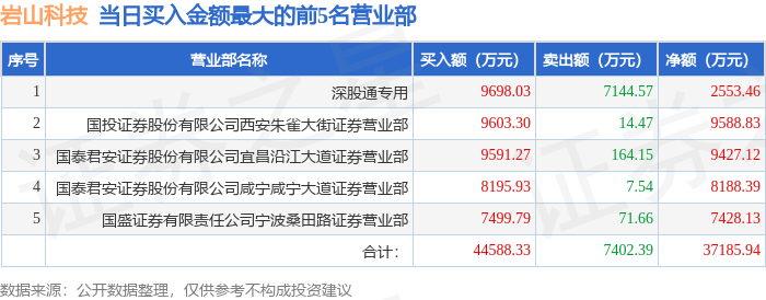 证券之星消息,沪深交易所2025年3月5日公布的交易公开信息显示,岩山科技(002195)因日涨幅偏离值达到7%的前5只证券登上龙虎榜。此次是近5个交易日内第1次上榜。