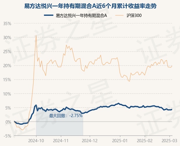 证券之星消息,3月5日,易方达悦兴一年持有期混合A最新单位净值为1.0257元,累计净值为1.0257元,较前一交易日上涨0.15%。历史数据显示该基金近1个月下跌0.72%,近3个月上涨0.12%,近6个月上涨4.31%,近1年上涨4.42%。该基金近6个月的累计收益率走势如下图: