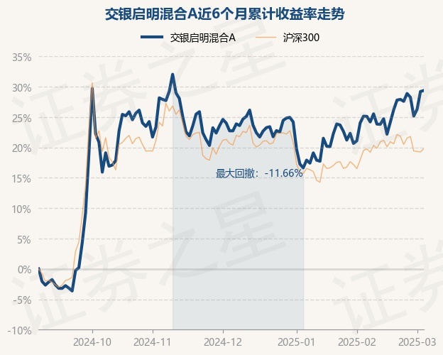 证券之星消息,3月5日,交银启明混合A最新单位净值为1.1971元,累计净值为1.3631元,较前一交易日上涨0.13%。历史数据显示该基金近1个月上涨6.85%,近3个月上涨5.42%,近6个月上涨29.37%,近1年上涨12.42%。该基金近6个月的累计收益率走势如下图: