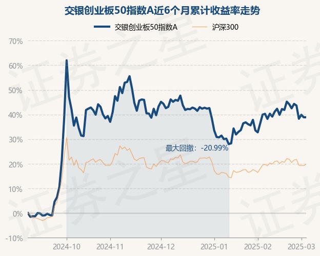 证券之星消息,3月5日,交银创业板50指数A最新单位净值为1.3599元,累计净值为1.4969元,较前一交易日上涨0.0%。历史数据显示该基金近1个月上涨4.64%,近3个月下跌2.89%,近6个月上涨38.75%,近1年上涨22.92%。该基金近6个月的累计收益率走势如下图: