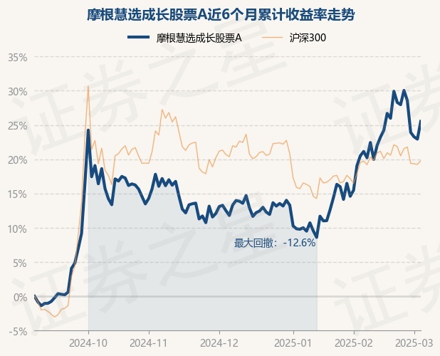 证券之星消息,3月5日,摩根慧选成长股票A最新单位净值为1.2659元,累计净值为1.2659元,较前一交易日上涨2.11%。历史数据显示该基金近1个月上涨8.69%,近3个月上涨12.27%,近6个月上涨25.52%,近1年上涨19.95%。该基金近6个月的累计收益率走势如下图: