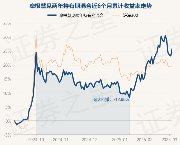 证券之星消息,3月5日,摩根慧见两年持有期混合最新单位净值为0.8075元,累计净值为0.8075元,较前一交易日上涨2.1%。历史数据显示该基金近1个月上涨8.77%,近3个月上涨12.4%,近6个月上涨25.8%,近1年上涨19.49%。该基金近6个月的累计收益率走势如下图: