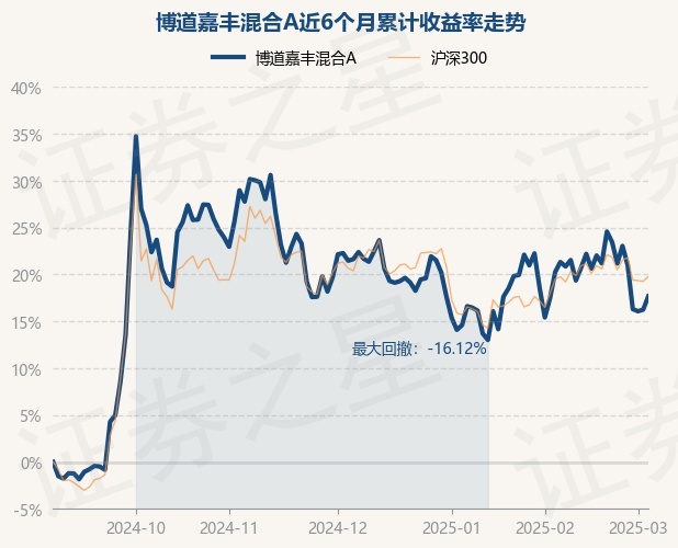 证券之星消息,3月5日,博道嘉丰混合A最新单位净值为0.6772元,累计净值为0.6772元,较前一交易日上涨1.23%。历史数据显示该基金近1个月上涨1.96%,近3个月下跌3.26%,近6个月上涨17.67%,近1年上涨2.4%。该基金近6个月的累计收益率走势如下图:
