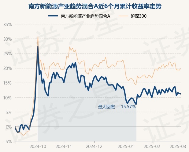 证券之星消息,3月5日,南方新能源产业趋势混合A最新单位净值为0.6265元,累计净值为0.6265元,较前一交易日下跌0.11%。历史数据显示该基金近1个月上涨1.11%,近3个月下跌3.7%,近6个月上涨11.16%,近1年上涨11.36%。该基金近6个月的累计收益率走势如下图: