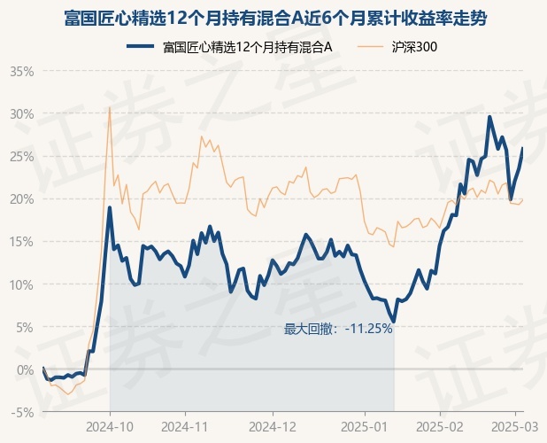 证券之星消息,3月5日,富国匠心精选12个月持有混合A最新单位净值为0.7869元,累计净值为0.7869元,较前一交易日上涨1.88%。历史数据显示该基金近1个月上涨9.93%,近3个月上涨12.83%,近6个月上涨25.78%,近1年上涨24.2%。该基金近6个月的累计收益率走势如下图: