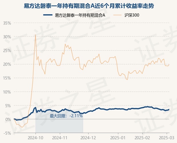 证券之星消息,3月5日,易方达磐泰一年持有期混合A最新单位净值为1.188元,累计净值为1.188元,较前一交易日上涨0.23%。历史数据显示该基金近1个月下跌0.59%,近3个月上涨0.64%,近6个月上涨3.48%,近1年上涨3.98%。该基金近6个月的累计收益率走势如下图: