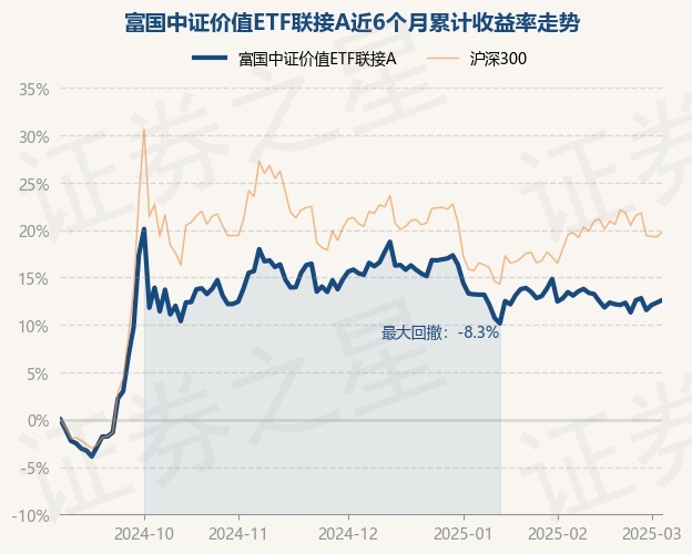 证券之星消息,3月5日,富国中证价值ETF联接A最新单位净值为1.8103元,累计净值为2.1006元,较前一交易日上涨0.23%。历史数据显示该基金近1个月上涨0.12%,近3个月下跌2.28%,近6个月上涨12.6%,近1年上涨5.57%。该基金近6个月的累计收益率走势如下图: