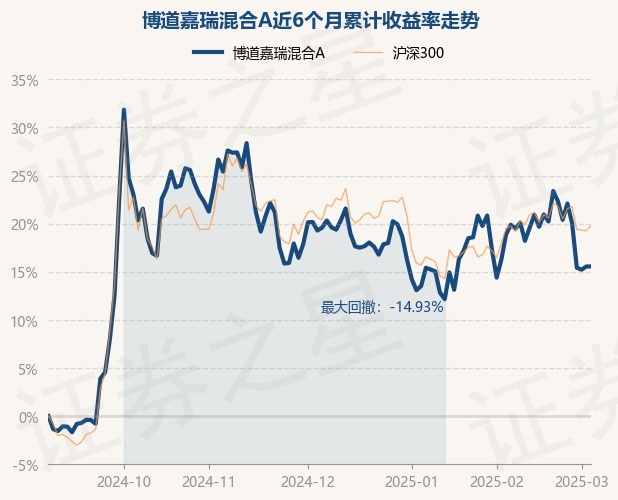 证券之星消息,3月5日,博道嘉瑞混合A最新单位净值为1.3681元,累计净值为1.3681元,较前一交易日上涨0.0%。历史数据显示该基金近1个月上涨2.23%,近3个月下跌2.2%,近6个月上涨16.95%,近1年上涨2.4%。该基金近6个月的累计收益率走势如下图:
