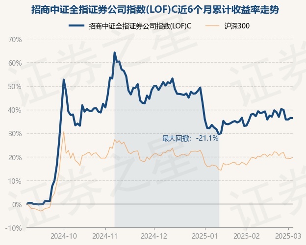 证券之星消息,3月5日,招商中证全指证券公司指数(LOF)C最新单位净值为1.1768元,累计净值为1.1768元,较前一交易日下跌0.05%。历史数据显示该基金近1个月上涨2.37%,近3个月下跌9.01%,近6个月上涨36.38%,近1年上涨22.34%。该基金近6个月的累计收益率走势如下图: