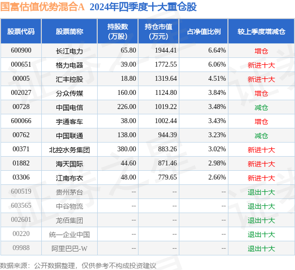 国富估值优势混合A为混合型-灵活基金,根据最新一期基金季报显示,该基金资产配置:股票占净值比84.56%,债券占净值比4.14%,现金占净值比20.27%。基金十大重仓股如下: