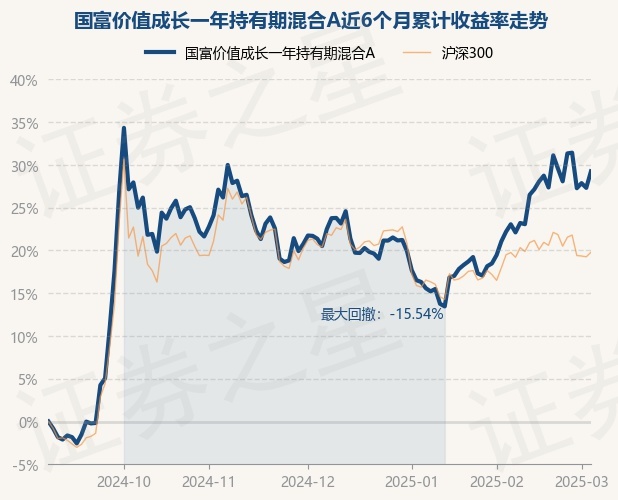 证券之星消息,3月5日,国富价值成长一年持有期混合A最新单位净值为0.9185元,累计净值为1.0639元,较前一交易日上涨1.51%。历史数据显示该基金近1个月上涨8.19%,近3个月上涨7.25%,近6个月上涨29.24%,近1年上涨21.7%。该基金近6个月的累计收益率走势如下图: