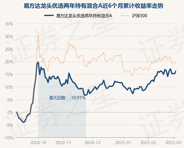 证券之星消息,3月5日,易方达龙头优选两年持有混合A最新单位净值为0.8687元,累计净值为0.8687元,较前一交易日上涨0.92%。历史数据显示该基金近1个月上涨4.66%,近3个月上涨6.77%,近6个月上涨16.28%,近1年上涨11.1%。该基金近6个月的累计收益率走势如下图: