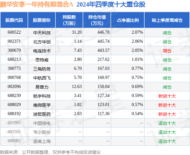 鹏华安享一年持有期混合A为混合型-偏债基金,根据最新一期基金季报显示,该基金资产配置:股票占净值比19.48%,债券占净值比44.73%,现金占净值比3.31%。基金十大重仓股如下:
