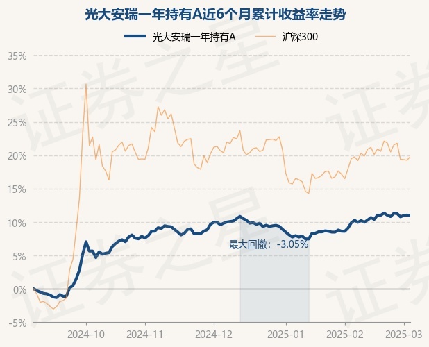 证券之星消息,3月5日,光大安瑞一年持有A最新单位净值为1.1691元,累计净值为1.1691元,较前一交易日下跌0.08%。历史数据显示该基金近1个月上涨2.16%,近3个月上涨1.03%,近6个月上涨10.95%,近1年上涨11.56%。该基金近6个月的累计收益率走势如下图: