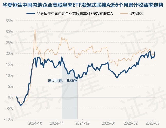 证券之星消息,3月5日,华夏恒生中国内地企业高股息率ETF发起式联接A最新单位净值为1.1941元,累计净值为1.1941元,较前一交易日上涨2.23%。历史数据显示该基金近1个月上涨6.93%,近3个月上涨9.4%,近6个月上涨20.6%,近1年上涨24.67%。该基金近6个月的累计收益率走势如下图: