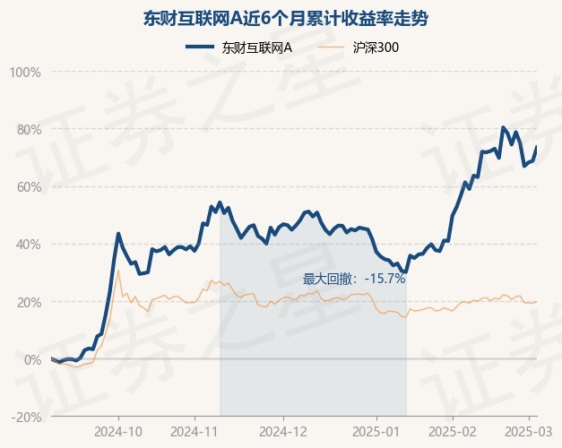 证券之星消息,3月5日,东财互联网A最新单位净值为0.877元,累计净值为0.877元,较前一交易日上涨2.79%。历史数据显示该基金近1个月上涨15.88%,近3个月上涨18.58%,近6个月上涨73.46%,近1年上涨63.74%。该基金近6个月的累计收益率走势如下图:
