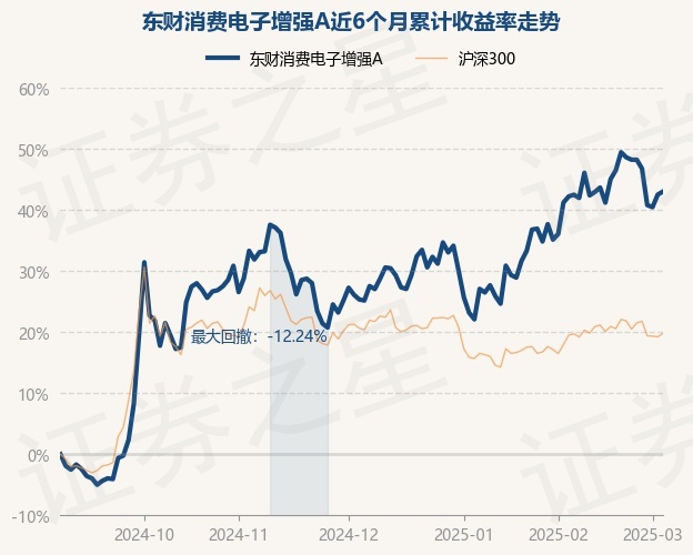 证券之星消息,3月5日,东财消费电子增强A最新单位净值为0.911元,累计净值为0.911元,较前一交易日上涨0.35%。历史数据显示该基金近1个月上涨5.11%,近3个月上涨14.26%,近6个月上涨43.04%,近1年上涨39.57%。该基金近6个月的累计收益率走势如下图: