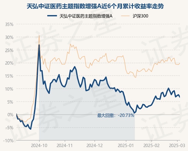 证券之星消息,3月5日,天弘中证医药主题指数增强A最新单位净值为0.6507元,累计净值为0.6507元,较前一交易日下跌0.81%。历史数据显示该基金近1个月上涨2.98%,近3个月下跌3.93%,近6个月上涨6.72%,近1年下跌9.06%。该基金近6个月的累计收益率走势如下图: